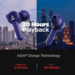 Ride through the highest waves of Nirvana on your boAt Airdopes 402 wireless earbuds. Drown in your favourite rhythm with its immersive 10mm drivers and boAt Signature Sound. Its IWP™️ technology and Bluetooth v5.2 offers a seamless and truly wireless listening experience. Let nothing come in between you and your music with its massive 30HRS of playback. Even if you manage to exhaust your battery, ASAP charge empowers you with another 60 minutes of playback within 5 minutes of charge. Let your thoughts echo clear and loud with ENx™️ technology that ensures crystal clear voice delivery. Navigating through your music and calls is a breeze with its Easy Touch Controls. Do it all and more with Airdopes 402
