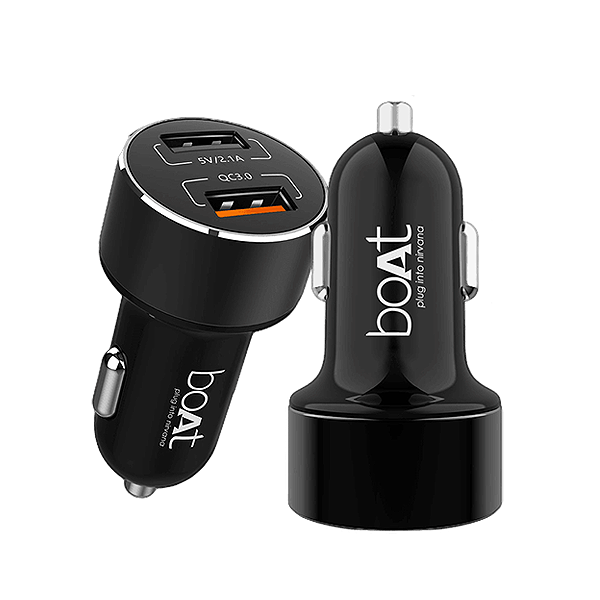 boAt Dual Rapid Car Quick charger 3.0 is engineered to refuel devices up to four times faster than any conventional charging. Equipped with exclusive Smart IC optimum smart charging technology that can power your compatible products and other non-Qualcomm Quick Charge devices up to 5 V / 2.1 Amps. Perfect for all your charging needs. Technology for fined tuned power output & a more optimized charging cycle up to 45% more efficient than Quick Charge 2.0. Compatible with a full range of USB-powered connection types tech whether Android, Apple, Bluetooth headphones or speakers, smart watches, dash cams, etc. The USB port adapts to your devices with advanced circuitry with built in safeguards to protect your devices against excessive current, overheating, and overcharging to provide the safest maximum recharge rate with up to 3A & 2.4A of dedicated output available, so you can plug it in any way for the most convenient charging experience. Even better, the sleek, minimalist design matches your car's interior and its small power light lets you know your device is charging.
